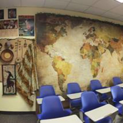 When she was out, I did a thorough cleaning of the place and then I planned how to decorate this new space. My first obstacle to overcome was the fact that three walls had a big conduit strip running around the wall, one wall was mostly book shelves and my most major wall had a white board on it that I never intended to use. The result was that my walls were not flat and I had three walls of posters from my last classroom. The biggest of which was a 8’ x 11’ map of the world. That map needed to be flat, so I went to the store and bought supplies to make a massive wooden frame that I could fit around the conduit and whiteboard. It was quite the custom job and I had all my major power tools on site to do it. It was an installation. The whiteboard was also magnetic, so I covered the remaining part not hidden by the wooden frame with a nice cloth and bought magnetic pins. I couldn’t do anything about the bookshelf. It was installed and carpet had been cut around it. Removing it meant a hole in the carpet. I’ll just have more books in the classroom and maybe an attractive art display (?). My posters were an issue because most were 36” and the space above and below the bulletin boards was only 33”. In order to hide the conduit (and the electrical outlets that I didn’t want kids plugging cell phones into), I extended either bulletin board frames or posters or both over the top so they would be hidden. The only outlets that remained in the classroom were for my computer, the TA’s computer and the chromecart, whenever it was in my classroom. Perfect!
